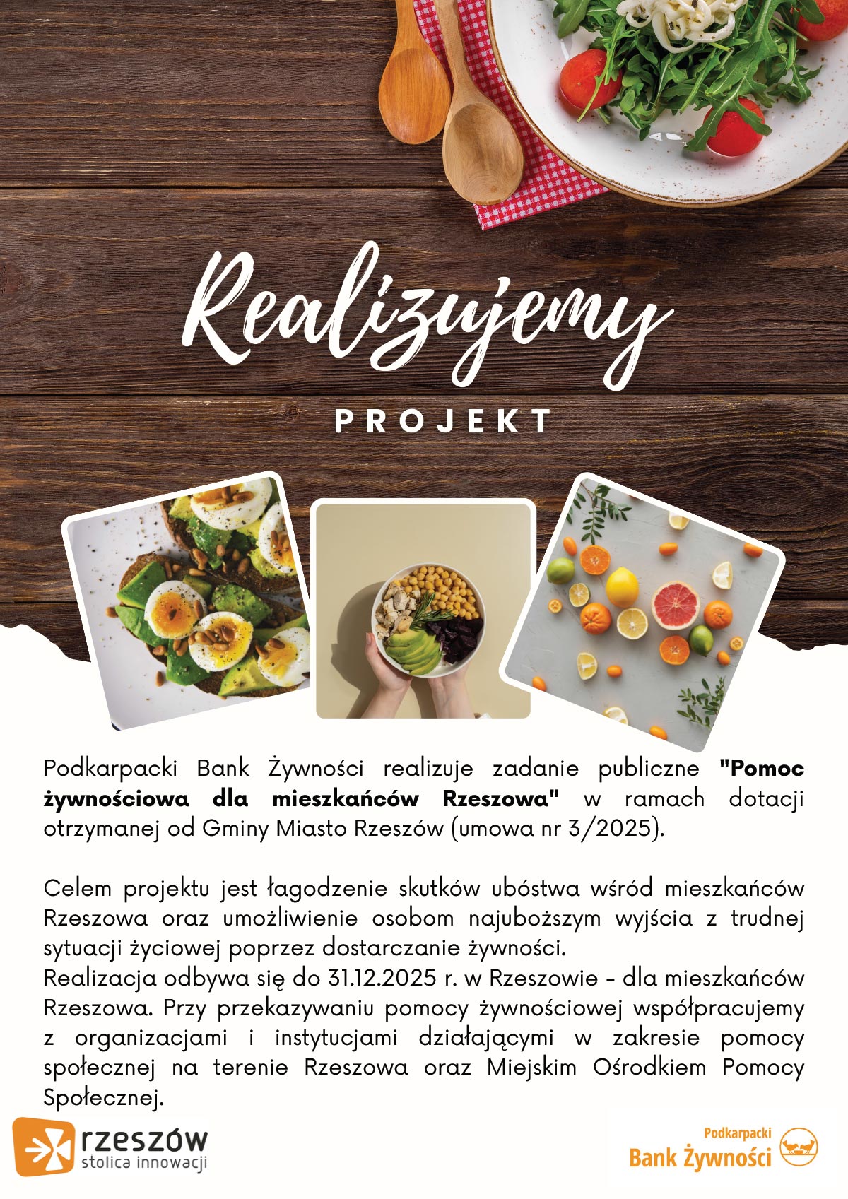 Celem projektu jest łagodzenie skutków ubóstwa wśród mieszkańców Rzeszowa oraz umożliwienie osobom najuboższym wyjścia z trudnej sytuacji życiowej poprzez dostarczanie żywności. Realizacja odbywa się w Rzeszowie i dla mieszkańców Rzeszowa. Przy przekazywaniu pomocy żywnościowej współpracujemy z organizacjami i instytucjami działającymi w zakresie pomocy społecznej na terenie Rzeszowa oraz Miejskim Ośrodkiem Pomocy Społecznej.