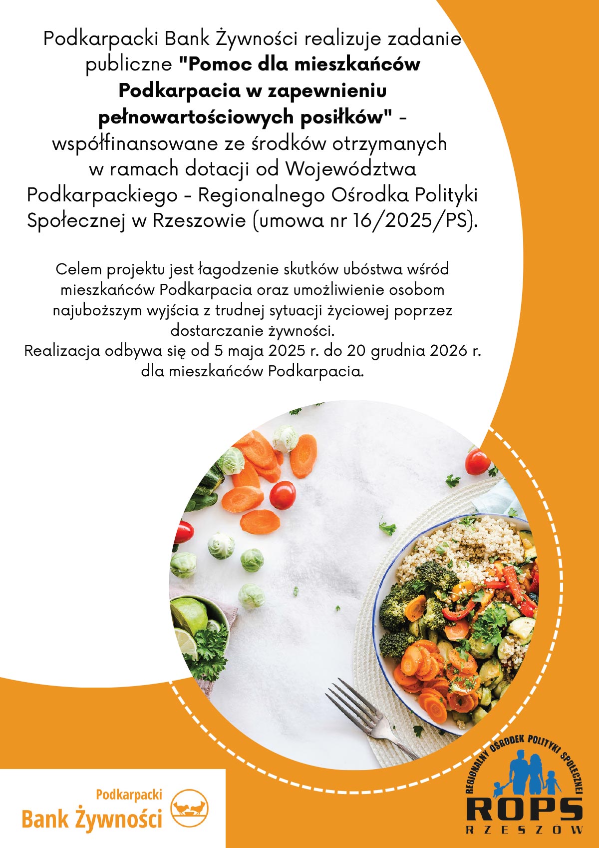 Podkarpacki Bank Żywności informuje, iż w terminie od 1 sierpnia do 15 grudnia 2024 r. realizuje zadanie publiczne „Pomoc dla mieszkańców Podkarpacia w zapewnieniu pełnowartościowych posiłków” – współfinansowane ze środków otrzymanych ramach dotacji od Województwa Podkarpackiego – Regionalnego Ośrodka Polityki Społecznej w Rzeszowie (umowa nr 9/2024/PS).